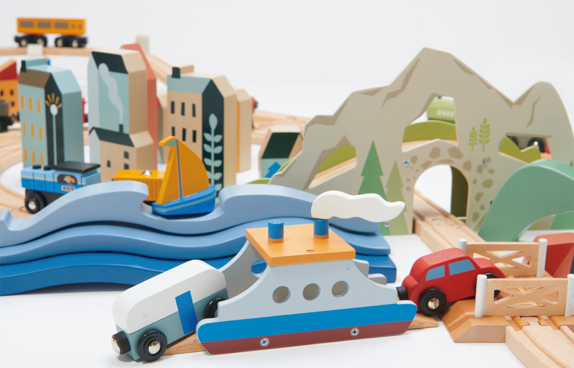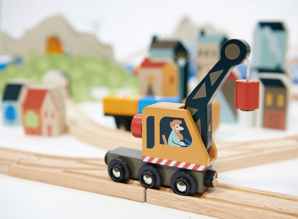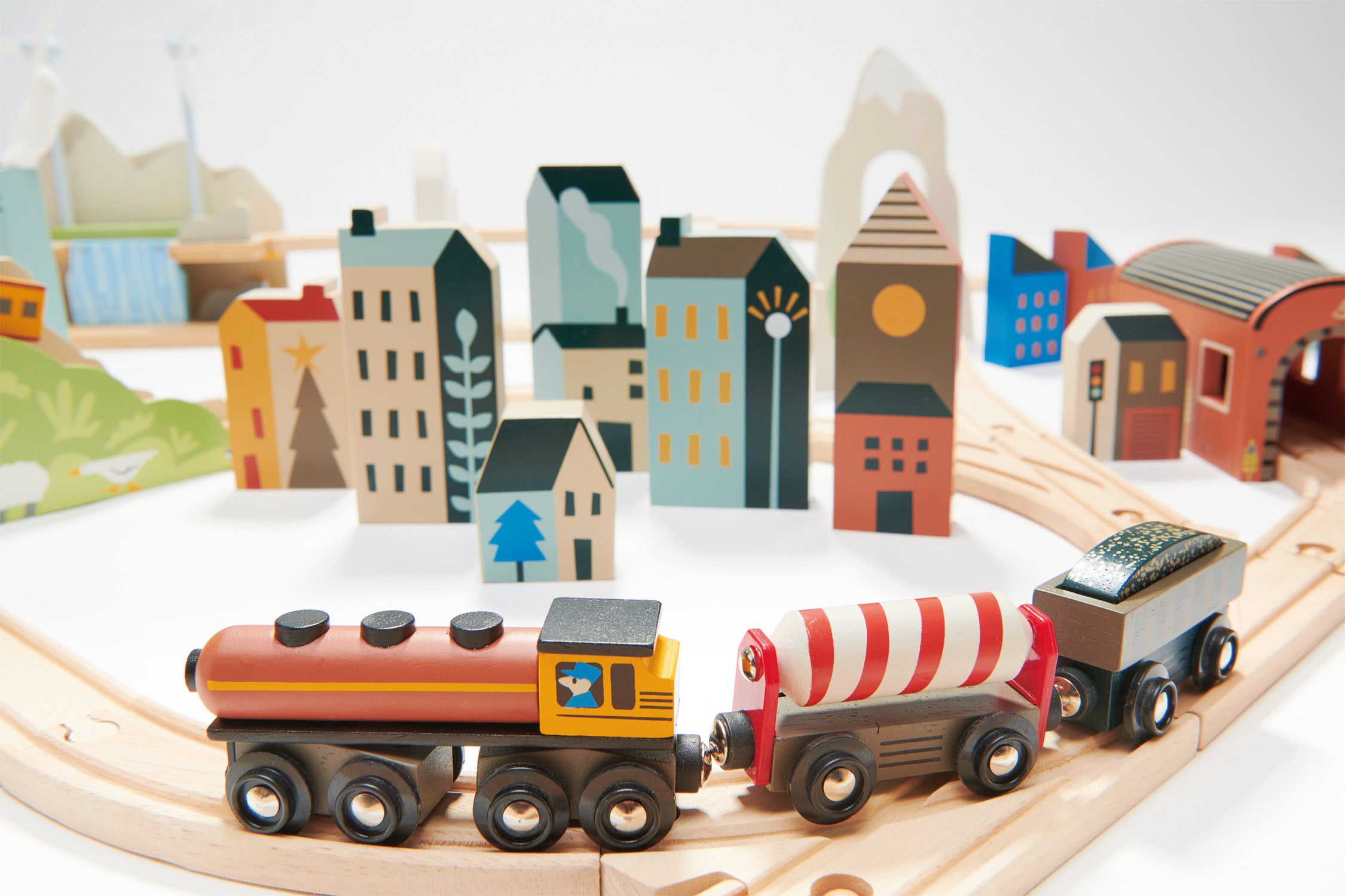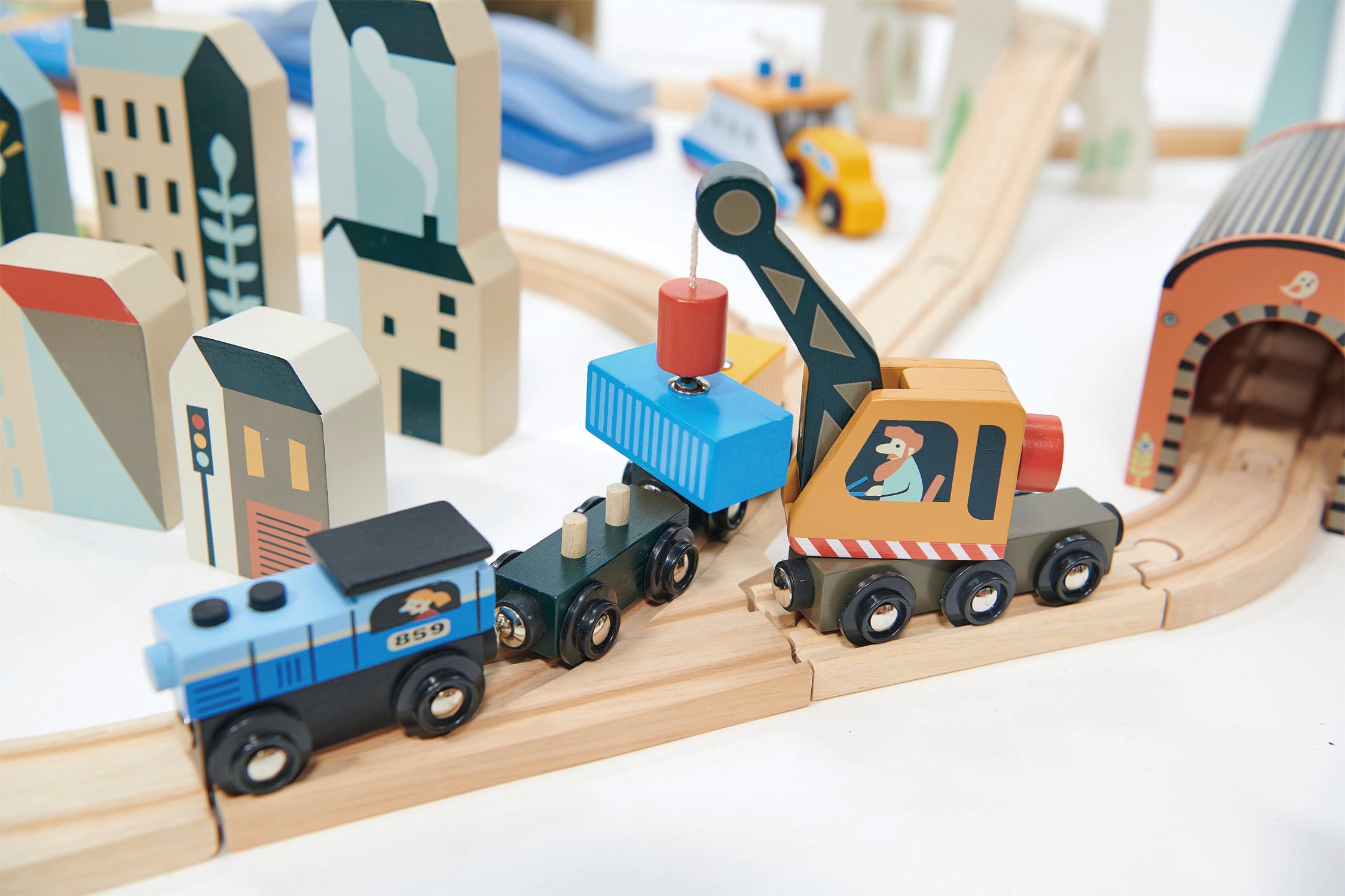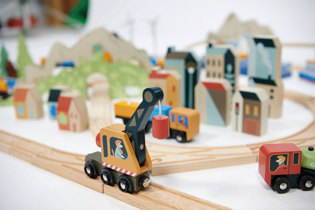 Nuestras vías del tren, fabricadas en madera son perfectas para que los pequeños puedan armar el circuito de sus sueños. Una vez lista la pista, elige donde quieres colocar la zona industrial, la ciudad y el bosque. Los ciudadanos de esta gran ciudad podrán recorrer las pistas para ir a trabajar a las fábricas, disfrutar a sus familias en la linda ciudad, y dar un paseo o vacacionar en la naturaleza. Este es nuestro set mas completo y diverso lo cual lo hace un juguete que inspira a infinitas creaciones y un sinfín de historias.