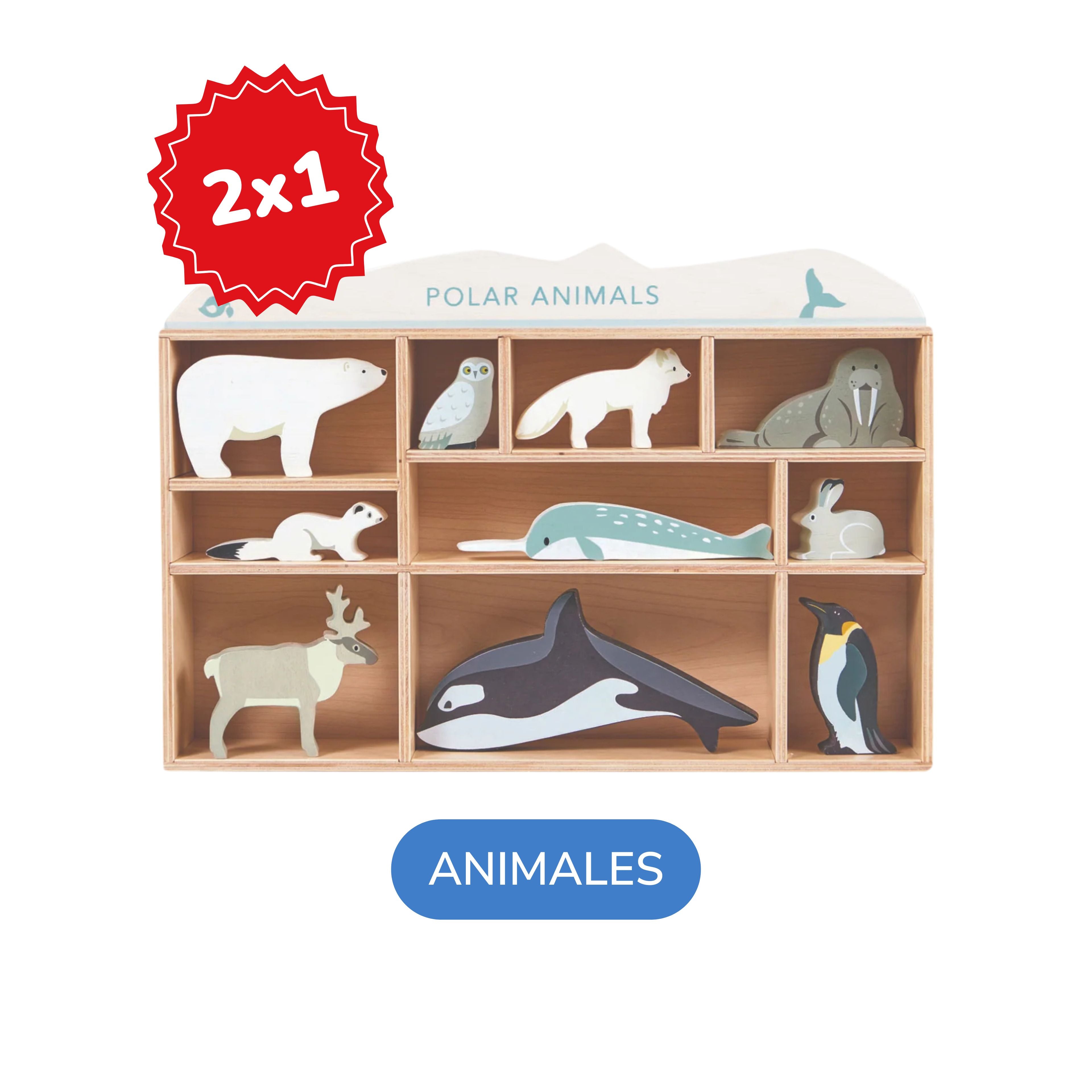 Estante organizador de madera con compartimentos de distintos tamaños que corresponden a 10 animales de la granja y un tractor. Las figuras de madera sólida, pintadas por ambos lados y con amigables diseños incluyen: una orca, un narval, una liebre de nieve, un zorro ártico, un pingüino rey, un búho, un armiño blanco, una morsa, un alce y, por supuesto, un oso polar.