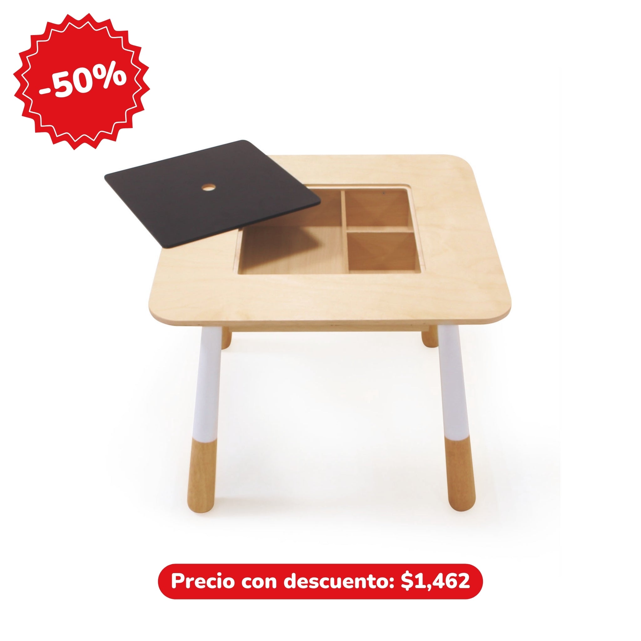 Nuestra mesa de madera cuenta con un compartimento oculto ideal para almacenar juguetes, material de arte o manualidades. Además, la tapa desmontable incluye un lado de pizarra. Esta mesa es perfecta para cualquier cuarto de juegos o habitación infantil. Proporciónales a tus pequeños un espacio especial y cómodo donde puedan jugar, crear y divertirse.