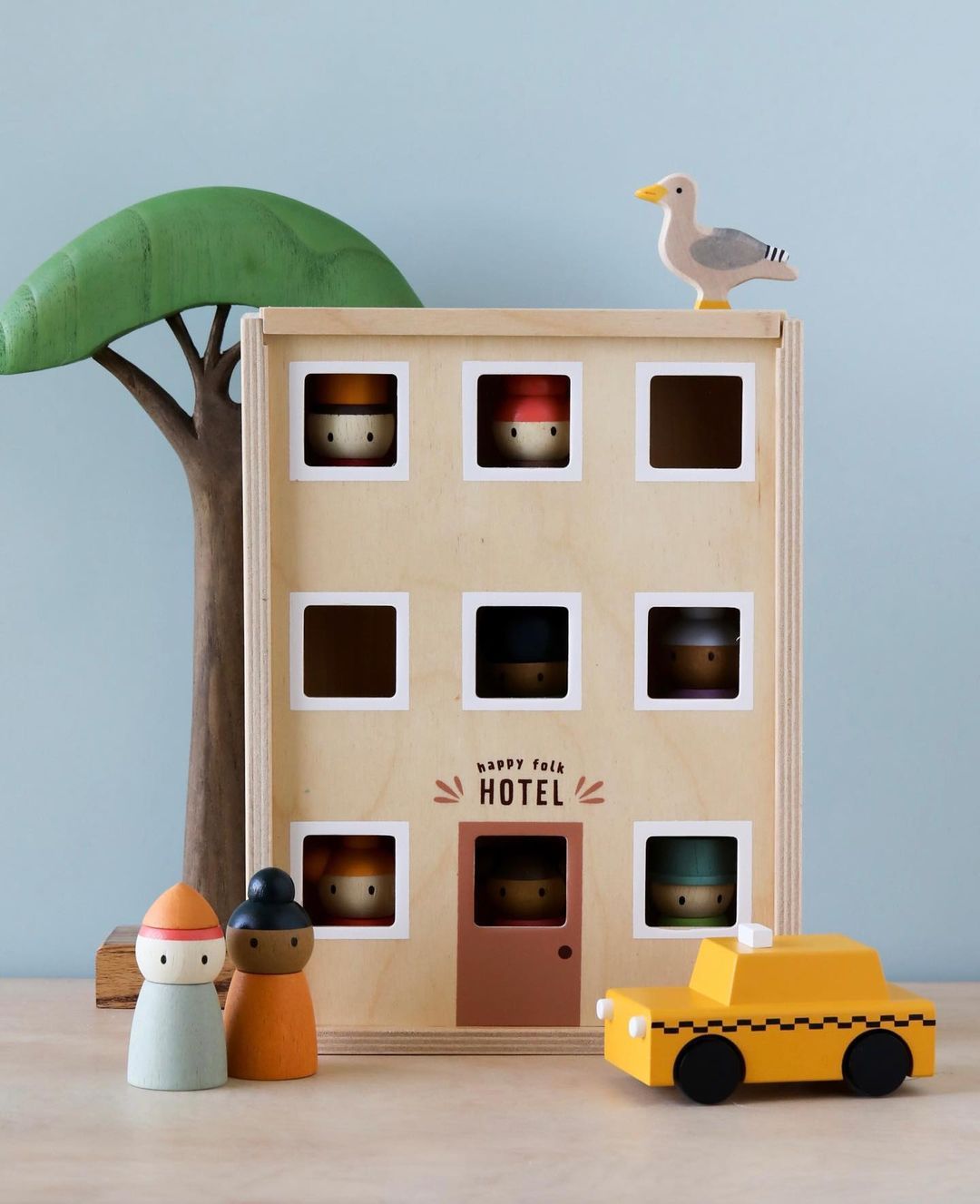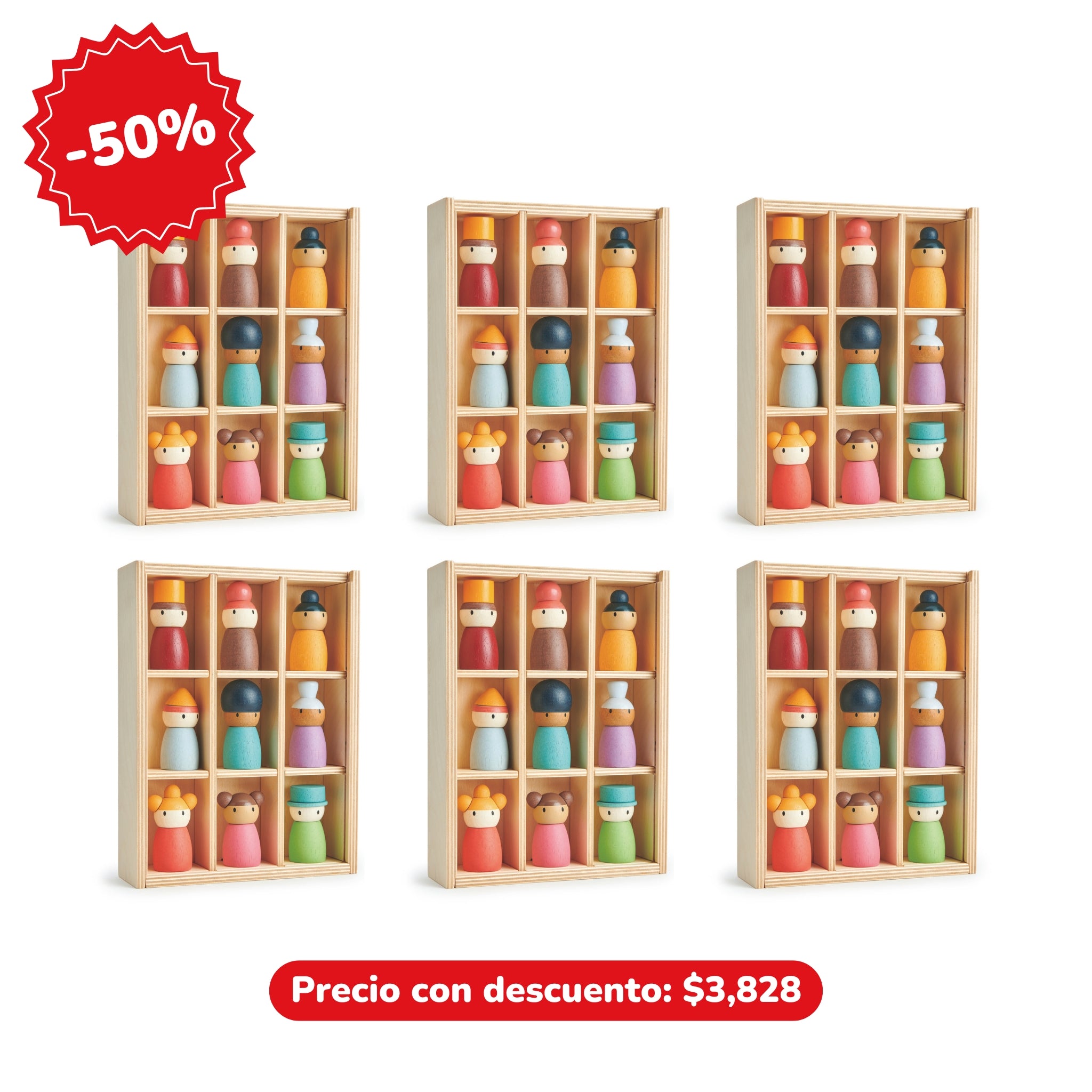 Estos personajes invitan a crear historias, reconocer rutinas y ordenar de forma natural al regresar cada muñeco a su espacio. Su diseño en madera permite un juego abierto, duradero y versátil que se adapta a distintas etapas del desarrollo.